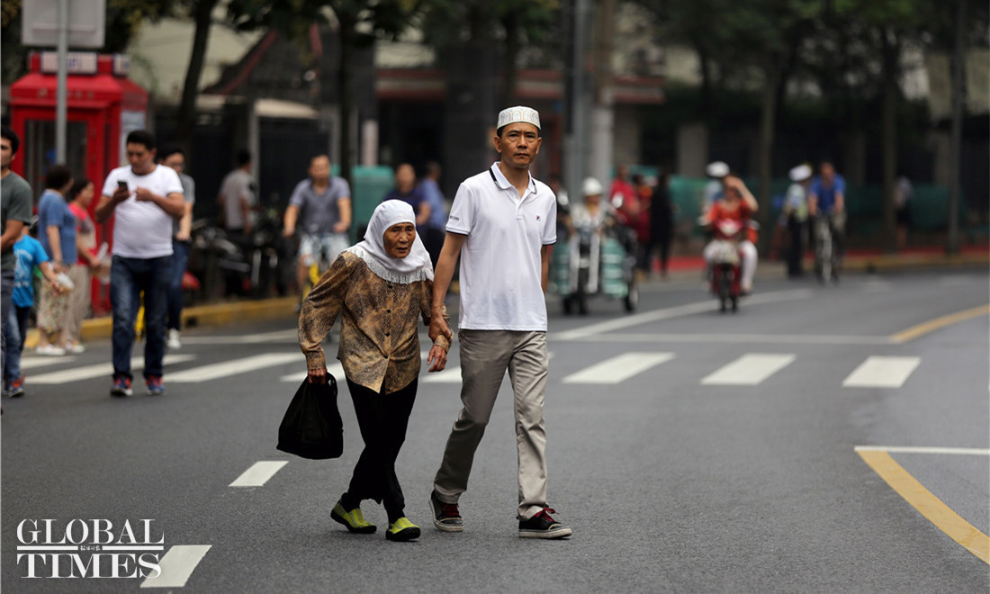 A Muslim man takes his mom to attend Eid al-Fitr prayers. Photo: Yang Hui/GT figcaption >