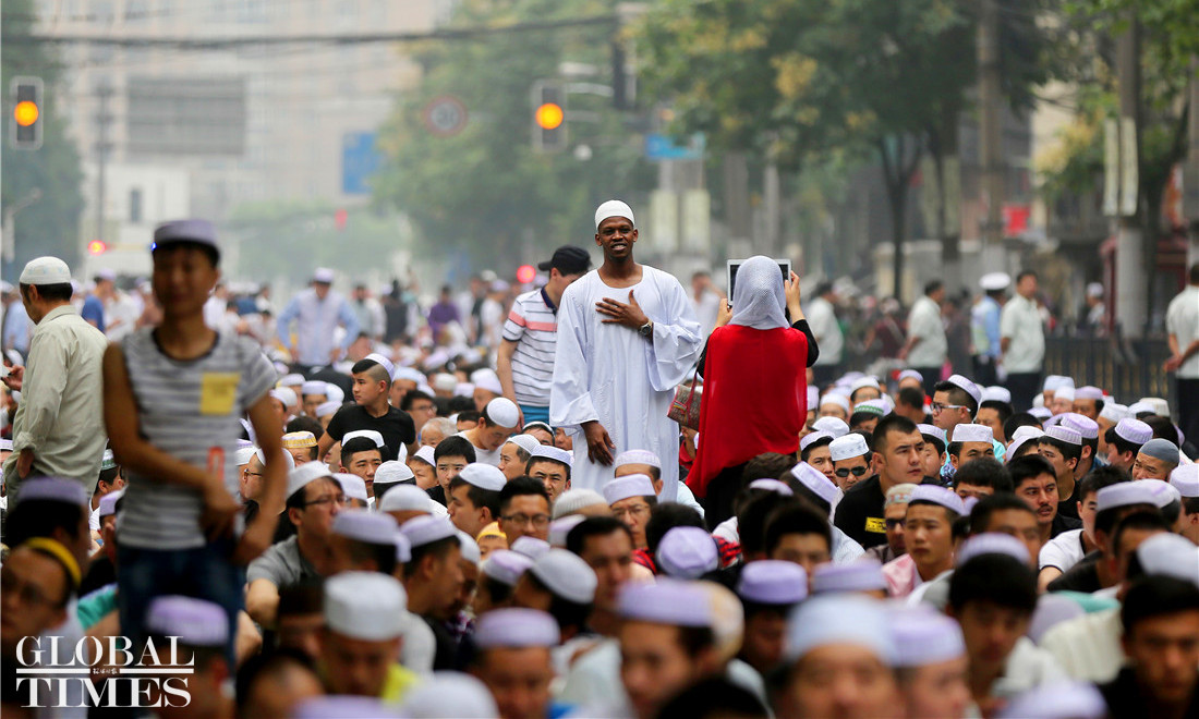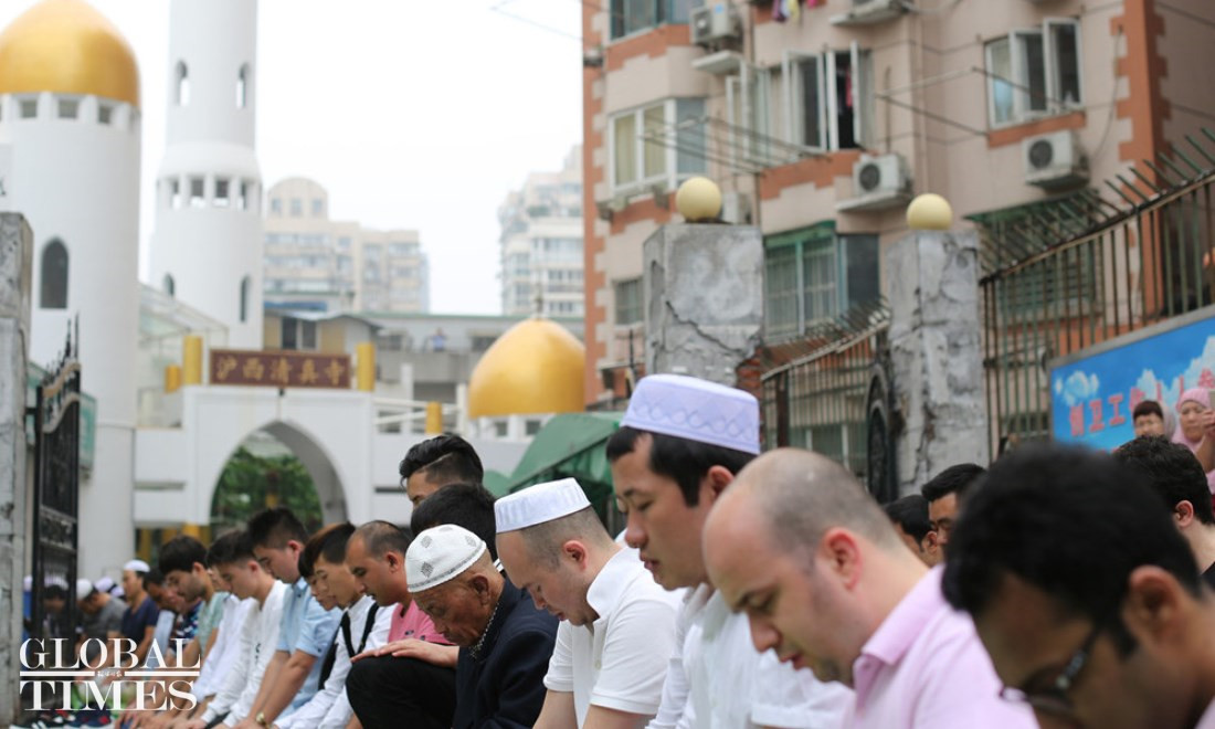 A foreign Muslim prays with Chinese Muslims outside of Huxi mosque on Eid al-Fitr. Photo: Yang Hui/GT figcaption >