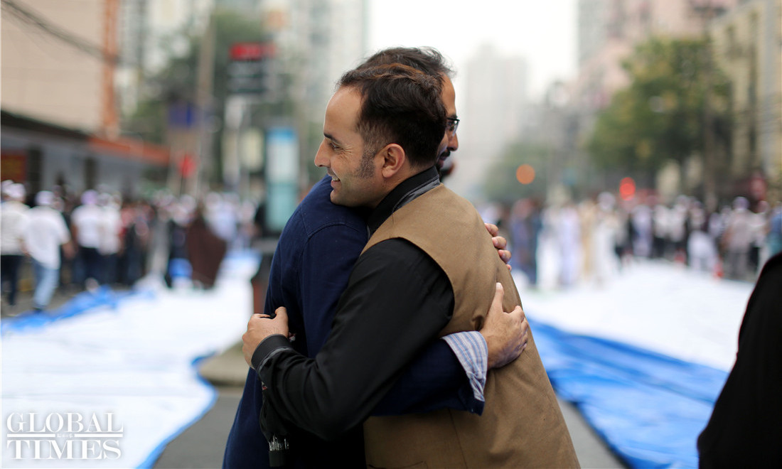 Two men hug outside of Huxi mosque on Eid al-Fitr. Photo: Yang Hui/GT figcaption >