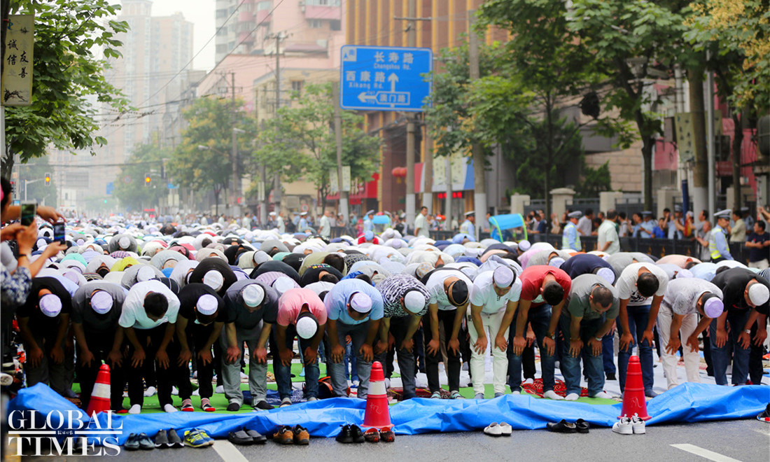 Shanghai Muslims came to Huxi mosque in Changde road to attend Eid al-Fitr prayers. Due to the limited space in Huxi mosque, hundreds of Muslims prayed on the road. Local security forces came and maintained the order during prayers. Photos: Yang Hui/GT