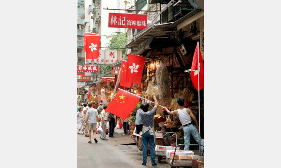 Residents decorate the street with Chinese national flags and Hong Kong regional flags on June 22, 1997, days before the return of Hong Kong to the motherland on July 1. Photo: people.com.cn figcaption >