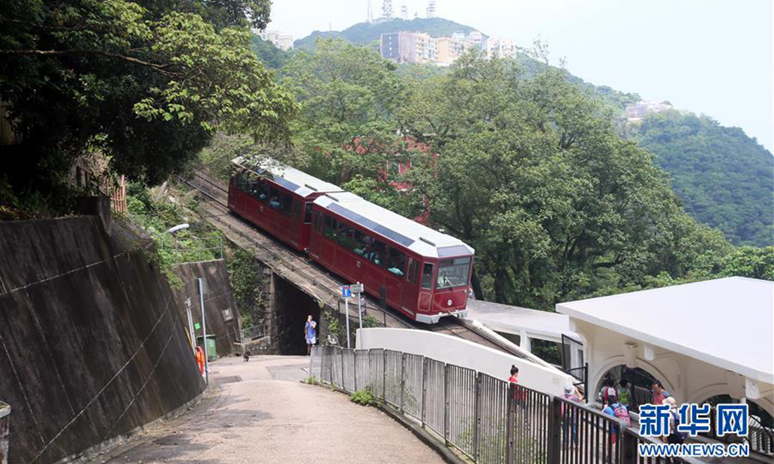 The hundred-year-old Peak Tram, one of the top tourist experiences in Hong Kong, arrives at the top of Victoria Peak on April 30, 2017. Photo: Xinhua figcaption >