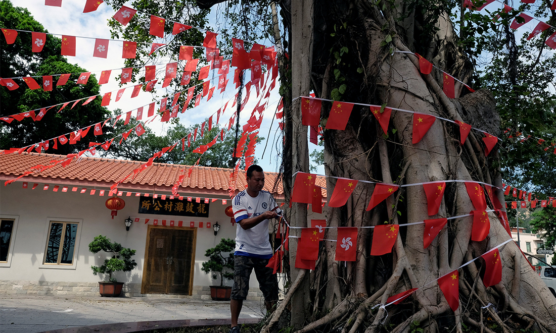 A local villager hangs Chinese national flags and Hong Kong regional flags on a tree on June 24, 2017 to celebrate the 20th anniversary of the return of Hong Kong to the motherland on July 1. Photo: CFP figcaption >