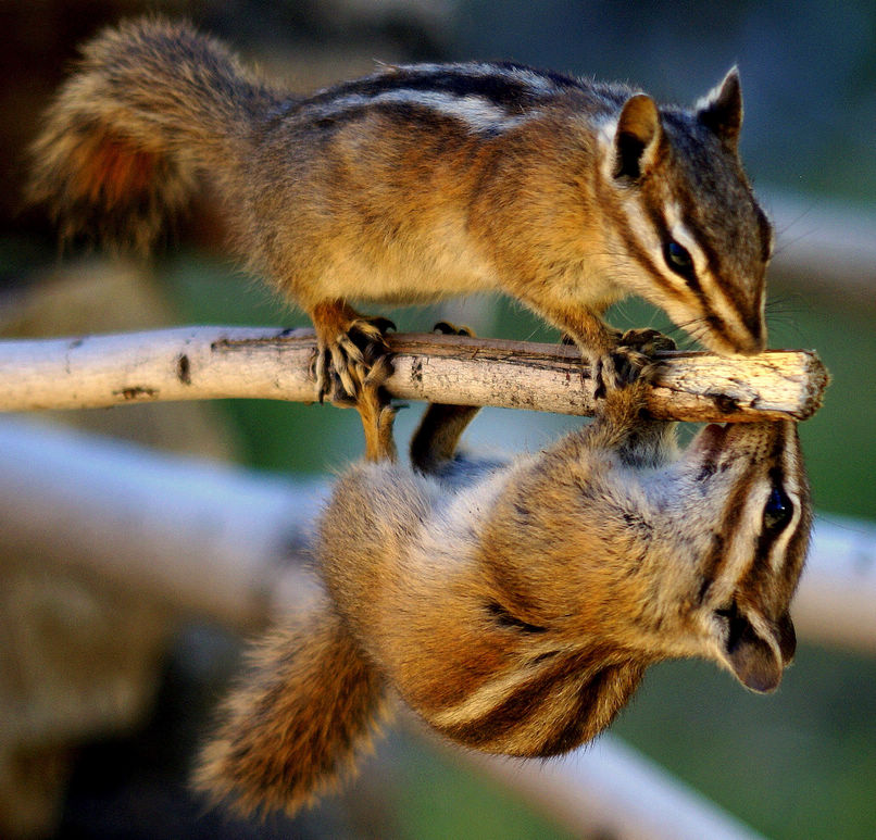 A chipmunk gazes lovingly at its playmate as it hangs from a tree. Photo: CFP figcaption >