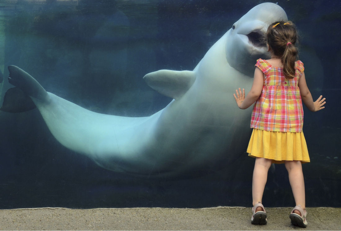 A 9-ton white whale kisses a girl called Veronica through a pane of glass. Photo: CFP figcaption >