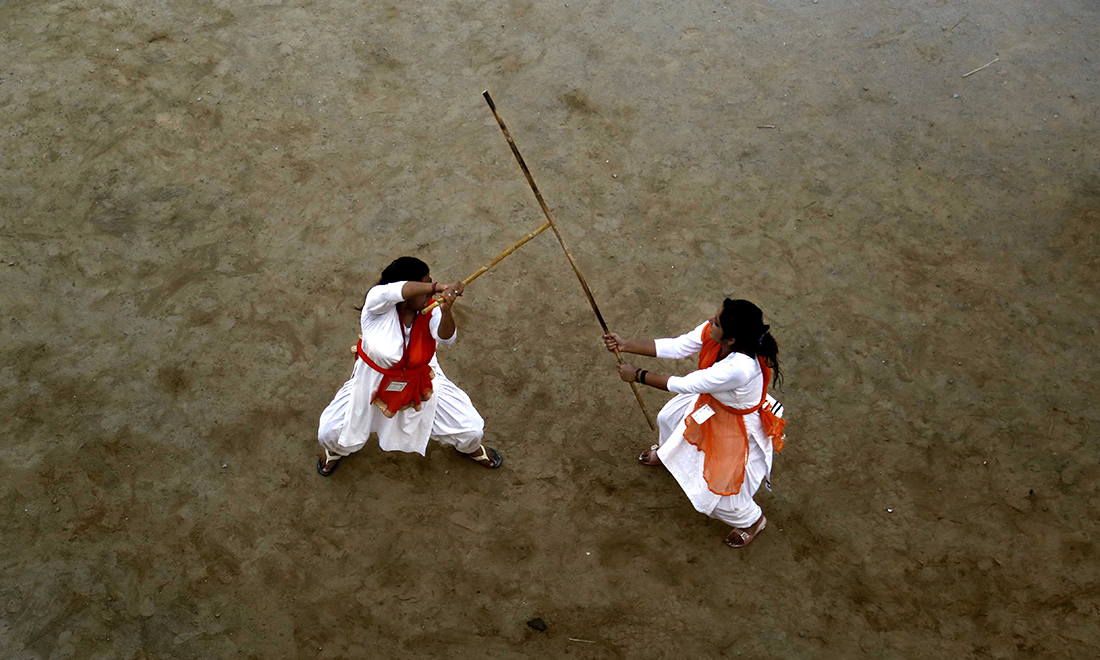 Two girls defend themselves with sticks at a training session on July 7 in Jammu, India. Photo: Nitin Kanotra/Hindustan Times via Getty Images/CFP figcaption >