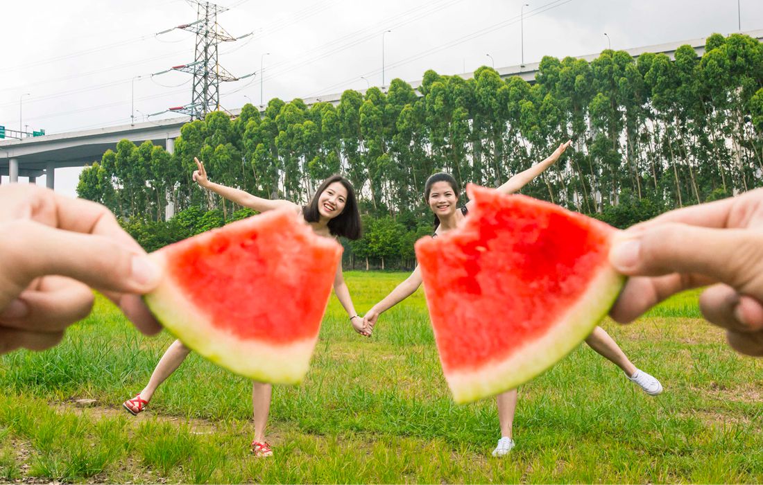 A photographer created cooling photos of two girls “wearing” watermelon dresses on a hot summer day in Baiyun District in China’s Guangzhou as a heat wave hits large part of China on July 7, 2017. Photo: CFP