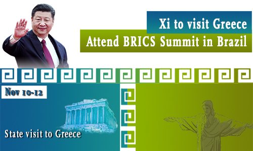 Chinese President Xi Jinping left Beijing on Nov 10 for a state visit to Greece and to attend the 11th BRICS summit in Brazil. ...