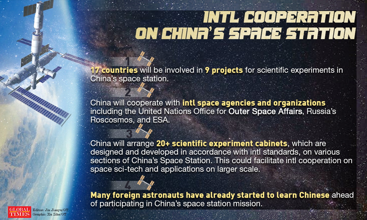Intl Co-op on China's upcoming Space Station includes: -17 nations will be involved in 9 projects for scientific experiments in China's space station -China will arrange ...