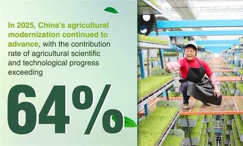 In 2025, China's agricultural modernization continued to advance: The contribution rate of agricultural scientific and technological progress exceeded 64%; 75.68 million mu (5.05 million ...