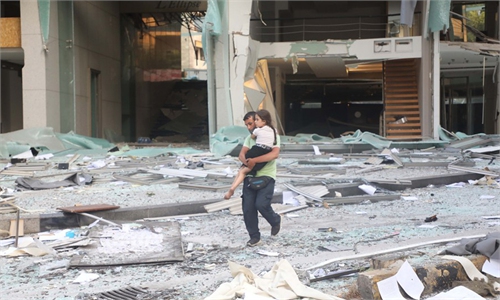 She stands nearly three meters tall with her arm raised, the wind whipping the hair away from her scarred face, and a broken clock at her feet with the hands showing 6:08, the time that a blast ripped through Beirut port on the evening of August 4.