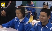 To protect students' eyesight and get them to sit up straight in class, a junior high school teacher in Fushun, Northeast China's Liaoning Province balances a long dowel across the heads of two students with a bunch of bananas tied to the middle of the stick.