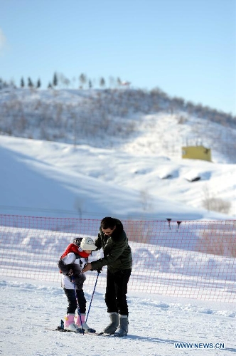A child learns skiing at Jiangjunshan Ski Resort in Altay, northwest China's Xinjiang Autonomous Region, Jan. 31, 2013. Thanks to its snow and ice resources, Altay received 87,300 traveler trips from mid-October of 2012 to Jan. 22 this year with tourism revenues hitting 58.49 million yuan (9.4 million US dollars). (Xinhua/Sadat)