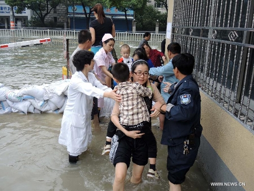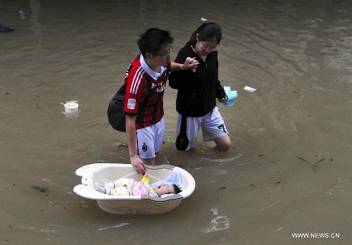 Qian Taiyuan(C) and his wife transfer their three-month-old son in a bathtub on a waterlogged road in Yuyao City, East China's Zhejiang Province, Oct. 9, 2013. The continuous rainfall brought by Typhoon Fitow caused heavy waterlog in some cities of Zhejiang. (Xinhua/Chen Binrong)