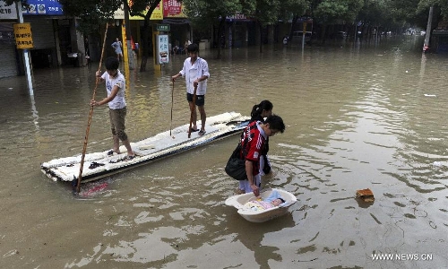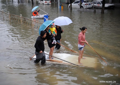 Local residents take a makeshift raft on a waterlogged road in downtown Yuyao City, East China's Zhejiang Province, Oct. 9, 2013. The continuous rainfall brought by Typhoon Fitow caused heavy waterlog in a large area of Yuyao. (Xinhua/Liang Zhen)