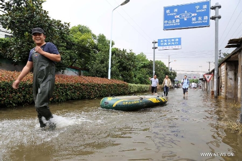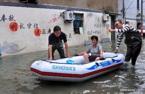 Local residents take a lifeboat on a waterlogged road in Ningbo City, East China's Zhejiang Province, Oct. 9, 2013. The continuous rainfall brought by Typhoon Fitow caused heavy waterlog in a large area of Yuyao. (Xinhua/Hu Xuejun)