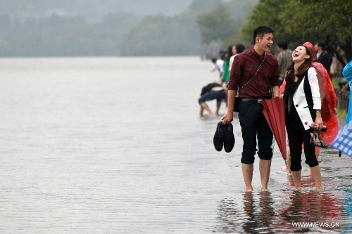 Tourists paddle on the waterlogged Bai Causeway over the West Lake in Hangzhou, capital of East China's Zhejiang Province, Oct. 9, 2013. The continuous rainfall brought by Typhoon Fitow caused heavy waterlog in some cities of Zhejiang. (Xinhua/Wu Huang)