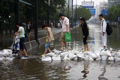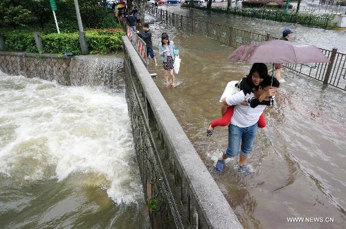Pedestrians wade across a waterlogged intersection in downtown Hangzhou, capital of East China's Zhejiang Province, Oct. 9, 2013. The continuous rainfall brought by Typhoon Fitow caused heavy waterlog in some cities of Zhejiang. (Xinhua/Wei Wei)