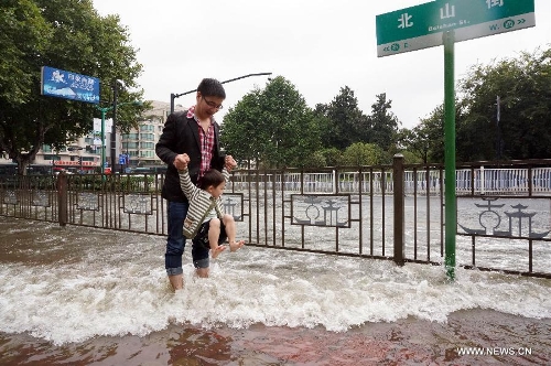 A man brings his child for a paddle on a waterlogged road in Hangzhou, East China's Zhejiang Province, Oct. 9, 2013. The continuous rainfall brought by Typhoon Fitow caused heavy waterlog in some cities of Zhejiang. (Xinhua/Wu Huang)