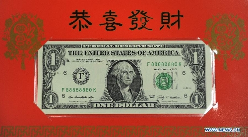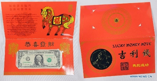 Photo taken on Dec. 3, 2013 shows appearance of the "Year of Horse" lucky money note during a press conference in Washington D.C., capital of the United States, Dec. 3, 2013. The US Treasury Department on Tuesday unveiled its latest seasonal addition to its one-dollar-note "Lucky Money" collection to celebrate the upcoming Chinese Lunar New Year of Horse in 2014. (Xinhua/Zhang Jun)
