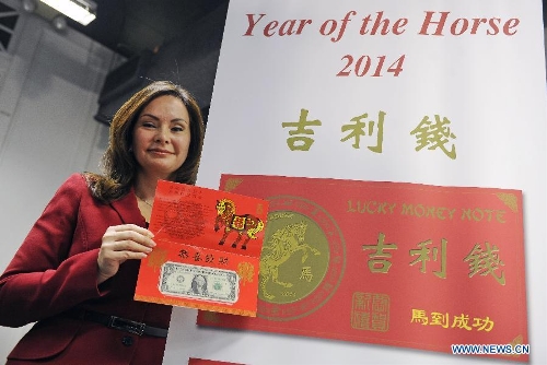 US Treasurer Rosie Rios displays the "Year of Horse" lucky money note during a press conference in Washington D.C., capital of the United States, Dec. 3, 2013. The US Treasury Department on Tuesday unveiled its latest seasonal addition to its one-dollar-note "Lucky Money" collection to celebrate the upcoming Chinese Lunar New Year of Horse in 2014. (Xinhua/Zhang Jun)