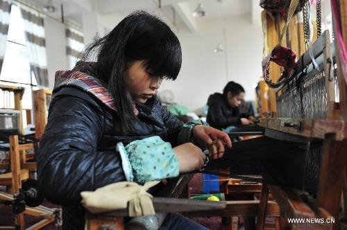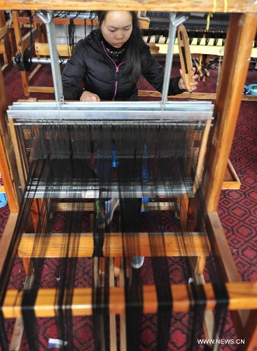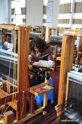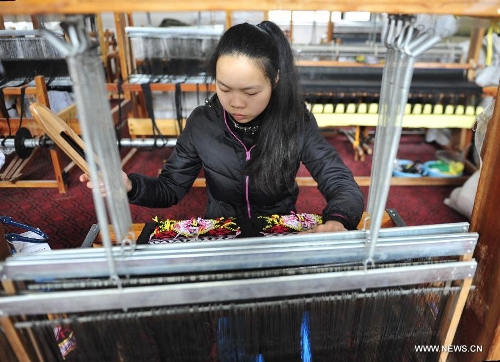 A woman of Tujia ethnic group makes Tujia brocade, known as Xilankapu in the Tujia language, on a loom at a brocade enterprise in Enshi, Central China's Hubei Province, March 10, 2014. As a traditional handicraft of the Tujia people, Xilankapu is woven with cotton and linen threads, and crosswise with cotton threads of various colors or silk threads, mainly used to decorate bedspreads. Listed in 2006 as one of China's National Intangible Heritages, Xilankapu came into full bloom in its protection and inheritance. (Xinhua/Xie Shun)