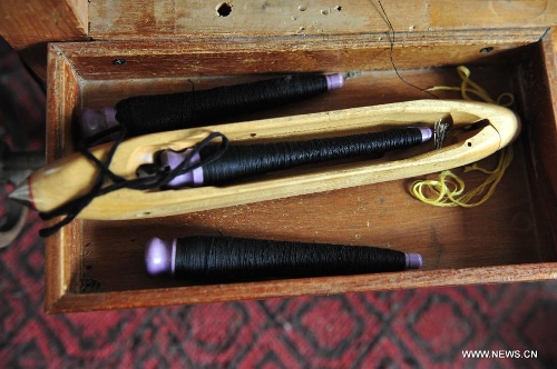 A spinning wheel used to make Tujia brocade, known as Xilankapu in the Tujia language, is seen at a brocade enterprise in Enshi, Central China's Hubei Province, March 10, 2014. As a traditional handicraft of the Tujia people, Xilankapu is woven with cotton and linen threads, and crosswise with cotton threads of various colors or silk threads, mainly used to decorate bedspreads. Listed in 2006 as one of China's National Intangible Heritages, Xilankapu came into full bloom in its protection and inheritance. (Xinhua/Xie Shun)