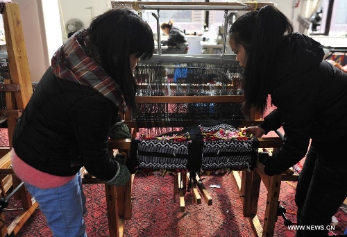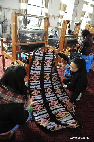 Women of Tujia ethnic group fold a piece of Tujia brocade, known as Xilankapu in the Tujia language, on a loom at a brocade enterprise in Enshi, Central China's Hubei Province, March 10, 2014. As a traditional handicraft of the Tujia people, Xilankapu is woven with cotton and linen threads, and crosswise with cotton threads of various colors or silk threads, mainly used to decorate bedspreads. Listed in 2006 as one of China's National Intangible Heritages, Xilankapu came into full bloom in its protection and inheritance. (Xinhua/Xie Shun)