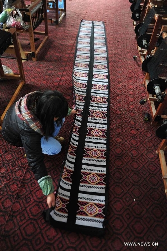 A woman of Tujia ethnic group folds a piece of Tujia brocade, known as Xilankapu in the Tujia language, at a brocade enterprise in Enshi, Central China's Hubei Province, March 10, 2014. As a traditional handicraft of the Tujia people, Xilankapu is woven with cotton and linen threads, and crosswise with cotton threads of various colors or silk threads, mainly used to decorate bedspreads. Listed in 2006 as one of China's National Intangible Heritages, Xilankapu came into full bloom in its protection and inheritance. (Xinhua/Xie Shun)