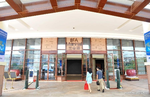 Media members walk to the entrance of the main hall of the Boao Forum for Asia (BFA) Annual Conference 2014 in Boao, south China's Hainan Proince, April 8, 2014. The forum will be held from April 8 to 11. (Xinhua/Chen Yehua)