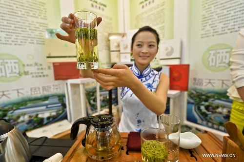 A lady shows a glass of green tea at the fourth China International Tea and Tea Ceremony Exhibition in Beijing, China, April 18, 2014. The four-day tea expo opened here Friday, attracting over 400 tea-related companies from home and abroad to show their products. (Xinhua/Wang Jingsheng)