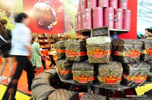 Boxes of Liupu tea are displayed at the fourth China International Tea and Tea Ceremony Exhibition in Beijing, China, April 18, 2014. The four-day tea expo opened here Friday, attracting over 400 tea-related companies from home and abroad to show their products. (Xinhua/Ma Zhiyu)