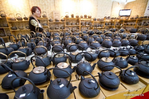 Japanese iron teapots are displayed at the fourth China International Tea and Tea Ceremony Exhibition in Beijing, China, April 18, 2014. The four-day tea expo opened here Friday, attracting over 400 tea-related companies from home and abroad to show their products. (Xinhua/Zhao Bing)