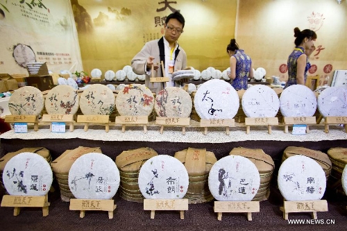 Tea cakes are displayed at the fourth China International Tea and Tea Ceremony Exhibition in Beijing, China, April 18, 2014. The four-day tea expo opened here Friday, attracting over 400 tea-related companies from home and abroad to show their products. (Xinhua/Zhao Bing)