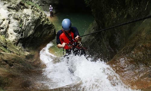 Tourists enjoy canyoning in Binzhou, Hunan Province.Photo: CFP