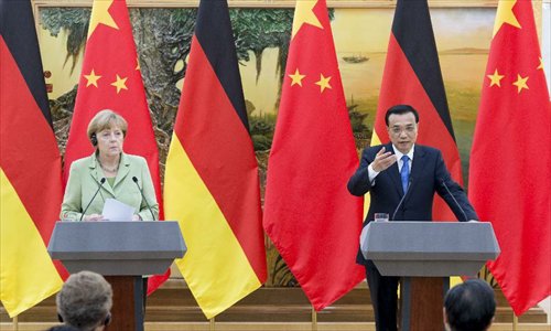 Chinese Premier Li Keqiang (R) and German Chancellor Angela Merkel meet the press after their talks in Beijing, capital of China, July 7, 2014. Photo: Xinhua