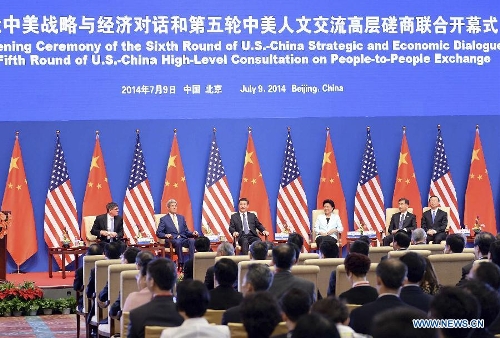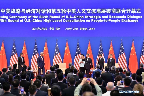 Chinese President Xi Jinping (3rd R) attends the joint opening ceremony of the Sixth Round of China-US Strategic and Economic Dialogue and the Fifth Round of China-US High-Level Consultation on People-to-People Exchange in Beijing, capital of China, July 9, 2014. (Xinhua/Li Tao)