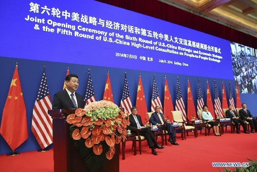 Chinese President Xi Jinping addresses the joint opening ceremony of the Sixth Round of China-US Strategic and Economic Dialogue and the Fifth Round of China-US High-Level Consultation on People-to-People Exchange in Beijing, capital of China, July 9, 2014. (Xinhua/Pang Xinglei)