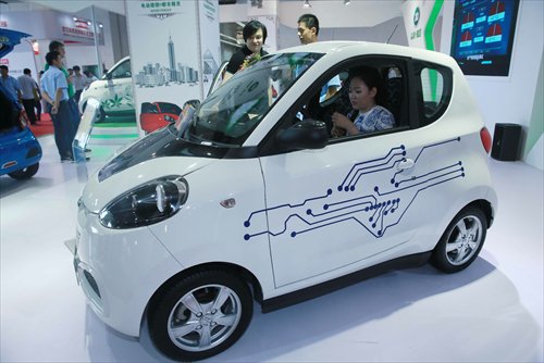 Visitors check out a mini green car at the 10th Beijing International Pure Electric Vehicles, Hybrid Electric Vehicles and Charging Station Exhibition on July 6 in Beijing. Photo: CFP