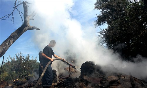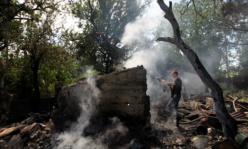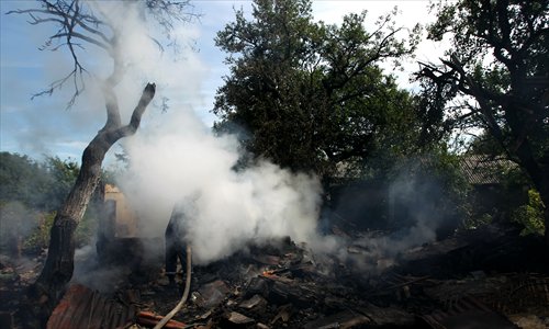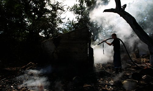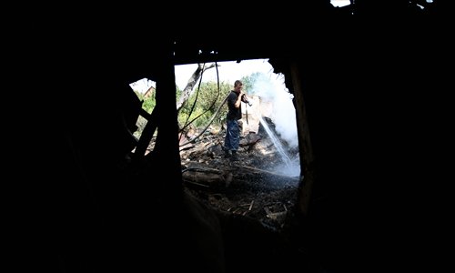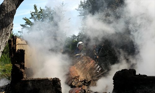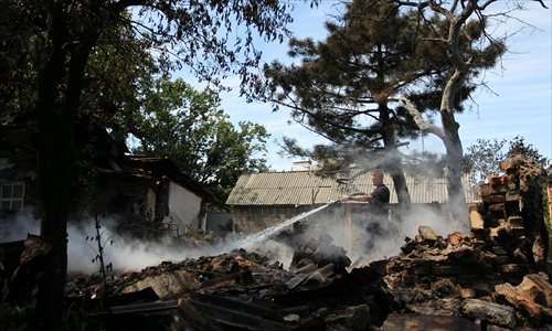 Firefighters extinguish the remains of a house in Donetsk, Ukraine on July 28. Several homes were destroyed in the strike. Photo: Cui Meng/GT