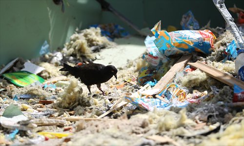 A pigeon scavenges for food at a destroyed grocery store in Donetsk, Ukraine on July 28. Photo: Cui Meng/GT