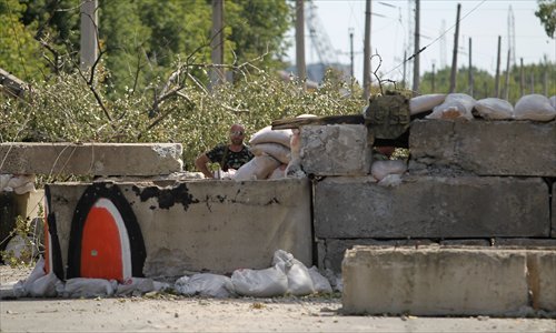 A man stands behind a makeshift barricade built by rebels in Donetsk, Ukraine on July 28. Photo: Cui Meng/GT