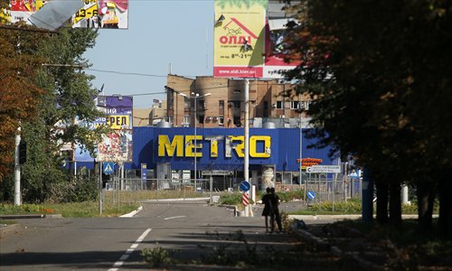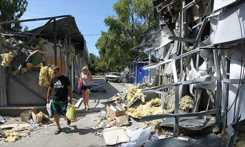 Two people walk through a neighborhood devastated by heavy fighting in Donetsk, Ukraine on July 28. Photo: Cui Meng/GT