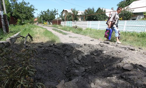 A local resident walks by a shell crater in Donetsk, Ukraine on July 28. Photo: Cui Meng/GT
