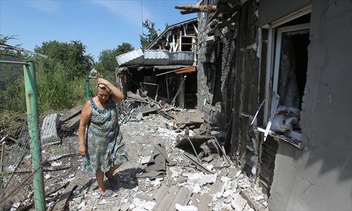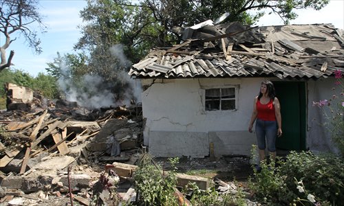 A woman stands in front of a house destroyed during crossfire between Ukrainian troops and rebel forces in Oktyabrsky district, Donetsk, east Ukraine, on Monday on July 28. Photo: Cui Meng/GT