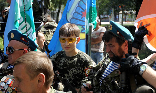 Flags, including those of the Soviet Airborne Troops and Russia, flew high on the vehicles. One of the trucks carried a banner seeking recruits for the Patriotic Forces of Donbass, one of the rebel movements.