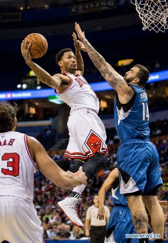 Derrick Rose (L) of Chicago Bulls lays up the ball during the NBA Preseason basketball game between Chicago Bulls and Minnesota Timberwolves at Scotttrade Center in St. Louis, the United States, on Oct. 24, 2014. Chicago Bulls lost 112-113. (Xinhua/Shen Ting)