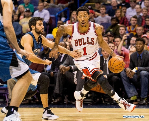 Derrick Rose (R) of Chicago Bulls drive the ball during the NBA Preseason basketball game between Chicago Bulls and Minnesota Timberwolves at Scotttrade Center in St. Louis, the United States, on Oct. 24, 2014. Chicago Bulls lost 112-113. (Xinhua/Shen Ting)
