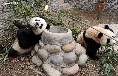 In this file photo taken on Dec. 15, 2010, male panda Kai Kai (R) and its female partner Xin Xin feed on bamboo leaves in their birthplace in southwest China's Sichuan Province. Kai Kai, along with Xin Xin, who died of acute renal failure and related ailments on June 22, 2014, were presented by the Chinese central government to Macao as a gift for the 10th anniversary of the Macao Special Administrative Region (SAR) in 2009. The Chinese central government will confer another pair of giant pandas to Macao, President Xi Jinping said here Friday, during his meeting with Chui Sai On, chief executive of the Macao SAR. (Xinhua/Chen Kai)