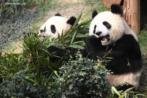 In this file photo taken on Dec. 15, 2010, male panda Kai Kai and its female partner Xin Xin feed on bamboo leaves in south china's Macao. Kai Kai, along with Xin Xin, who died of acute renal failure and related ailments on June 22, 2014, were presented by the Chinese central government to Macao as a gift for the 10th anniversary of the Macao Special Administrative Region (SAR) in 2009. The Chinese central government will confer another pair of giant pandas to Macao, President Xi Jinping said here Friday, during his meeting with Chui Sai On, chief executive of the Macao SAR. (Xinhua/Cheong Kam Ka)